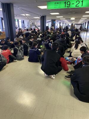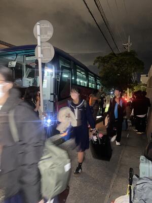 2年生修学旅行団、学級ごとにニライセンターへ到着しています。