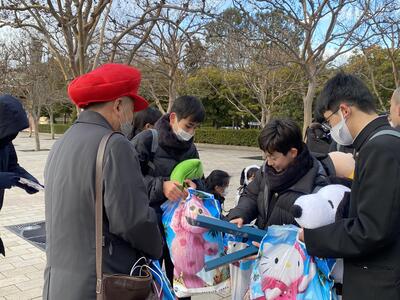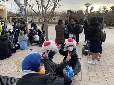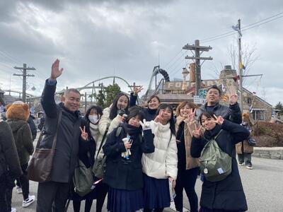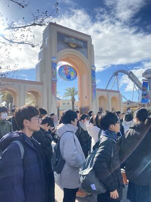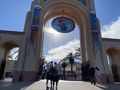 USJでの自由行動が終わり、続々と集合してきています。USJを満喫した様子の子どもたちと、校長先生!